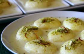 This is made with soft paneer balls soaked in a sweetened milk garnished with nuts and served chilled.