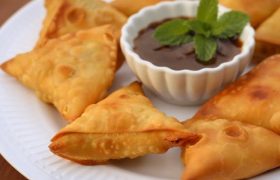 A samosa is a fried pastry with a savory filling, including ingredients such as spiced potatoes, onions, peas, meat or fish.