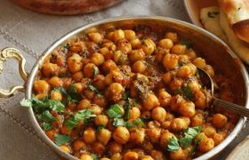 The chickpeas are cooked with Indian spices, onion-tomato paste, and some coconut milk.