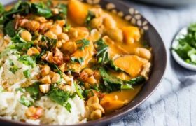 This African chicken peanut stew is packed full of chicken thighs, sweet potatoes, chickpeas, and collard greens.
